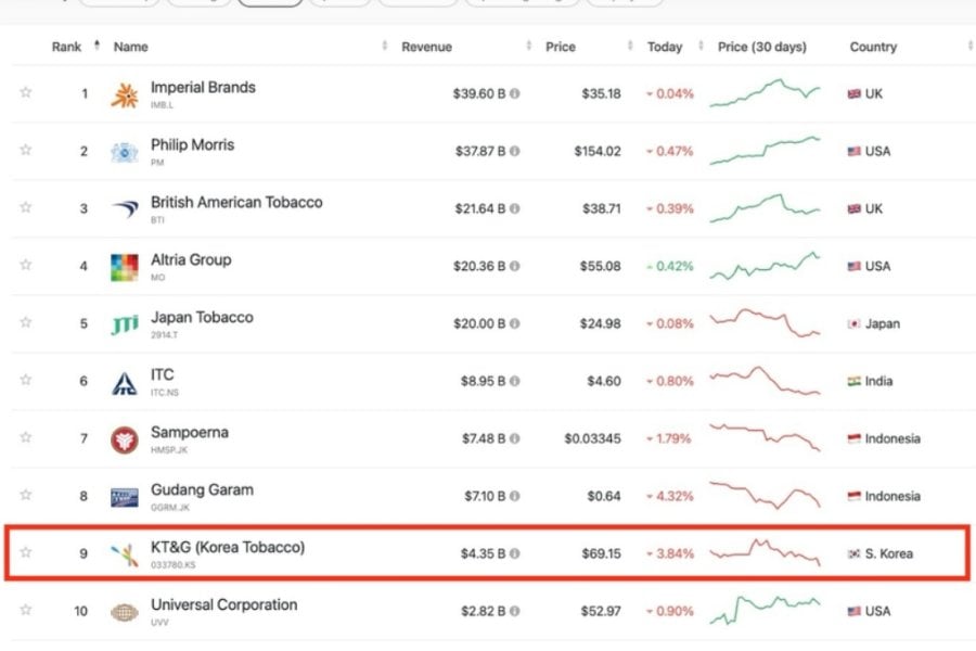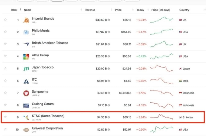 kt&g도 10위권에 들어감..
