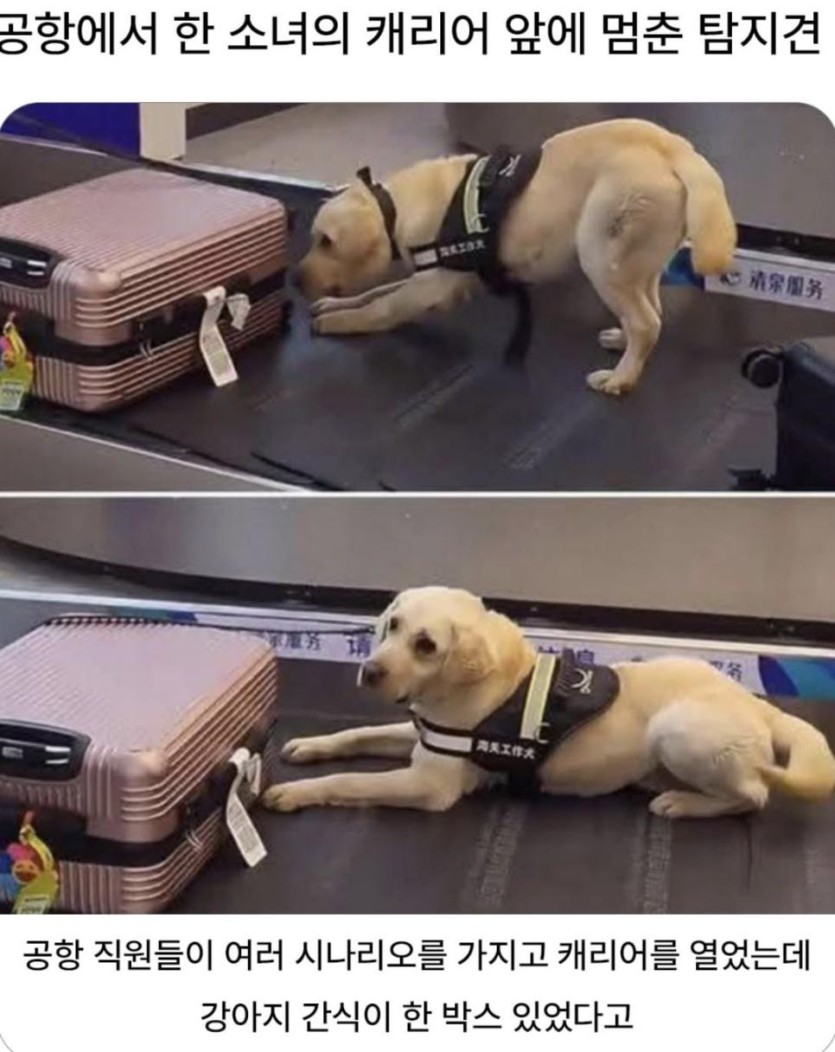 공항에서 한 소녀의 캐리어 앞에 멈춘 탐지견