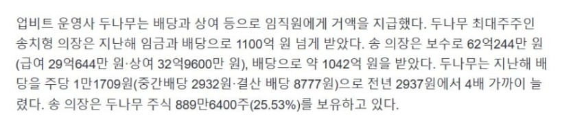 작년에만 1,100억 벌은 아재 rh1 0 168 0 2025.04.03 12:15 두나무 창업자 아재 작년에만 보수로 62억,배당으로 1042억 받음 ㄷㄷㄷㄷㄷㄷㄷㄷㄷㄷ 79년생.. 작년에만 1,100억 벌은 아재 0
