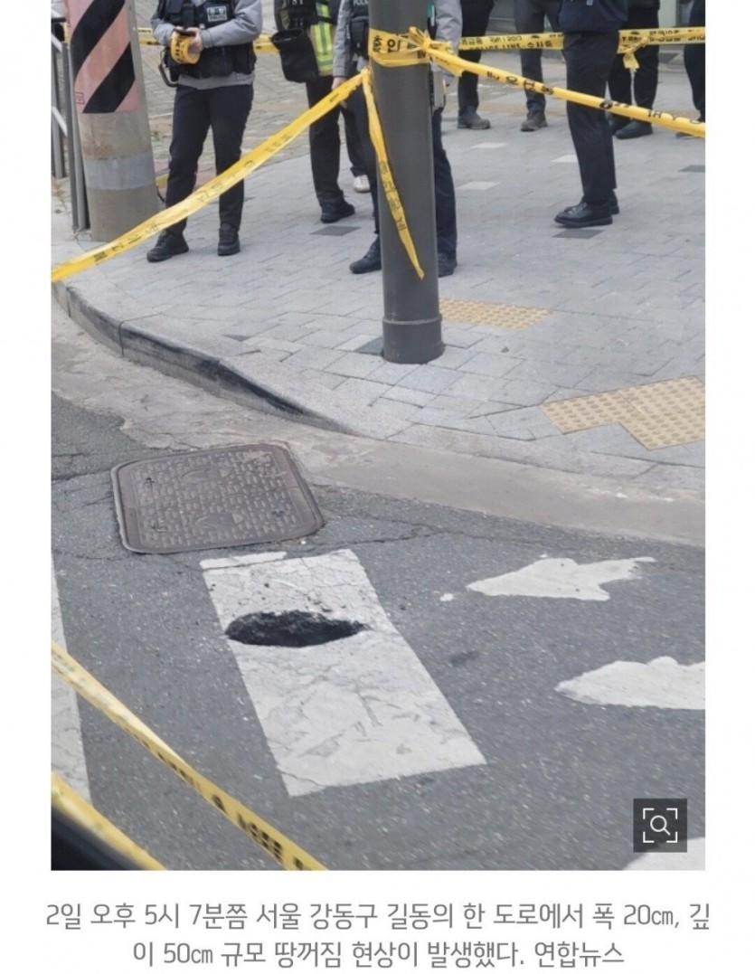 2일 강동구청은 이날 오후 5시 7분쯤 서울 강동구 길동의 한 도로에서 폭 20㎝, 깊이 50㎝ 규모 땅꺼짐 현상이 발생했다고 밝혔다.