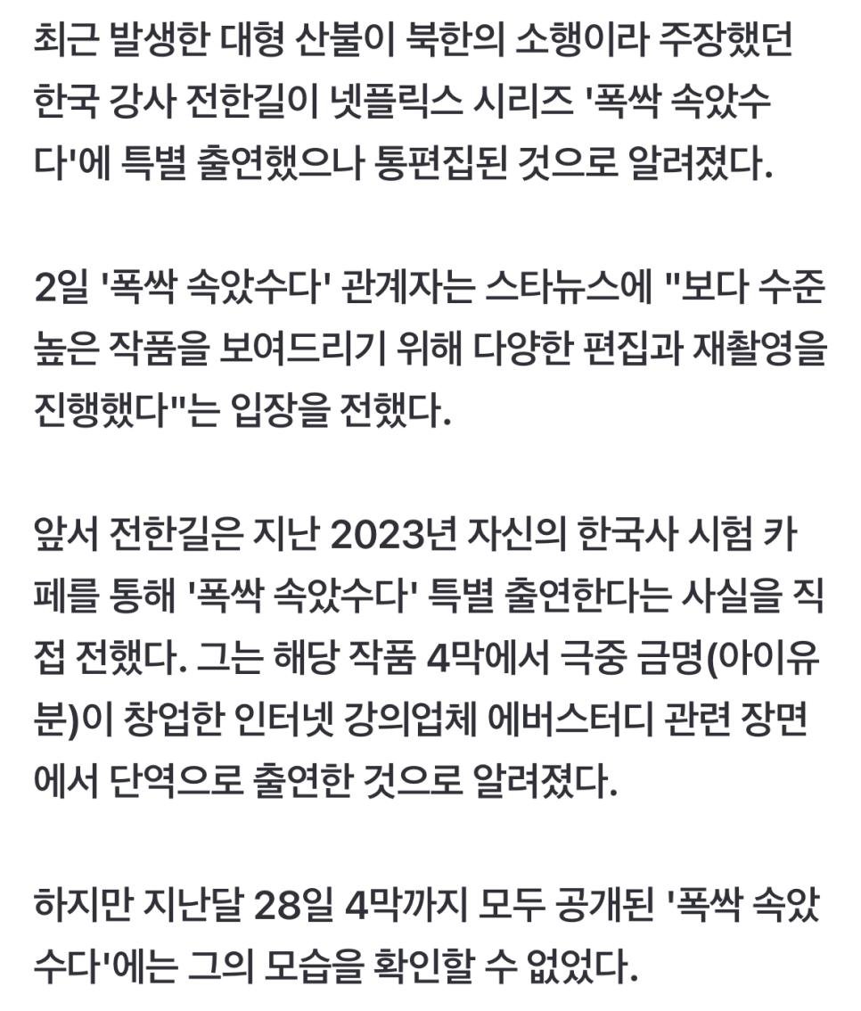전한길 폭싹 속았수다 특별출연 통편집이 된 이유