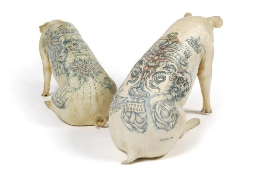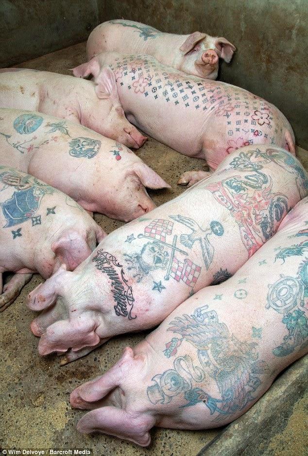 벨기에 예술가인 윔 델보예(Wim Delvoye)는 돼지 피부에 문신을 새기는 예술을 활동을 한다. 윔 델보예가 돼지 등에 유명 명품 브랜드 로고 문신을 새겨 주목을 받은 이후, 독일에서 동물 문신이 유행하기 시작하면서 이에 대한 반발이 일어났다. 독일에서 동물 문신이 성행하면서 법원이 동물보호법에 위반된다는 이유로 동물 문신 금지명령을 내렸다. 이후 뎀보예는 독일에서 동물에게 문신을 하지 못하고 중국으로 진출했다. 중국 베이징에 있는 한 돼지 농장은 주말이면 독특한 돼지들을 보려고 찾아온 방문객들로 붐빈다. 벨기에 예술가 윔 델보예의 문신 돼지를 보기 위해서다. 델보예와 제자들은 돼지들의 피부에 독수리나 해골 등을 새기거나 명품 브랜드 루이비통의 독특한 로고를 돼지의 머리부터 꼬리까지 빽빽이 수놓기도 했다. 이렇게 문신이 새겨진 돼지가죽은 최대 5,500파운드(약 9,100만원)에 거래되고 있다. 명품 브랜드 샤넬은 이 돼지가죽으로 가방을 만들어 판매한 것으로 알려졌다. 일부 동물보호 운동가들은 이에 대해 동물들이 상업적 목적 때문에 불필요한 고통을 받고 있다고 비난하고 있다. 델보예는 “무엇이 예술인가를 판단하는 잣대를 들이대는 건 애초부터 적절하지 않다.”고 강력하게 주장하면서 “일부 주장과는 달리 돼지들이 문신 시술 당시 피부에 마취를 했기 때문에 특별히 고통을 느끼진 않는다.”고 반박했다.