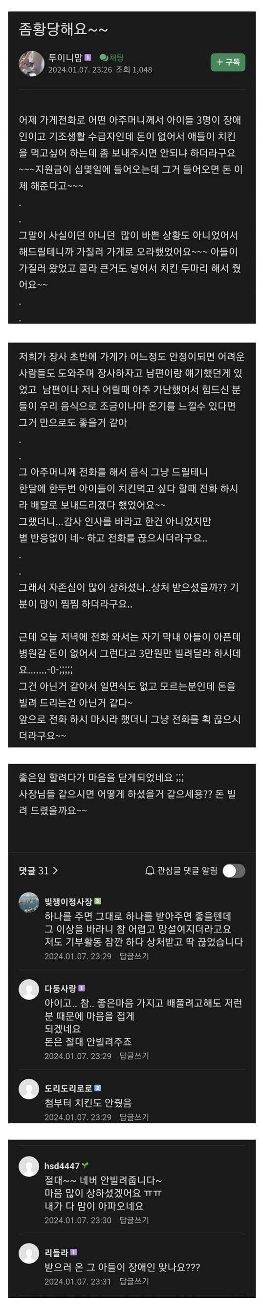공짜 치킨 줬더니 돈 달라는 여자