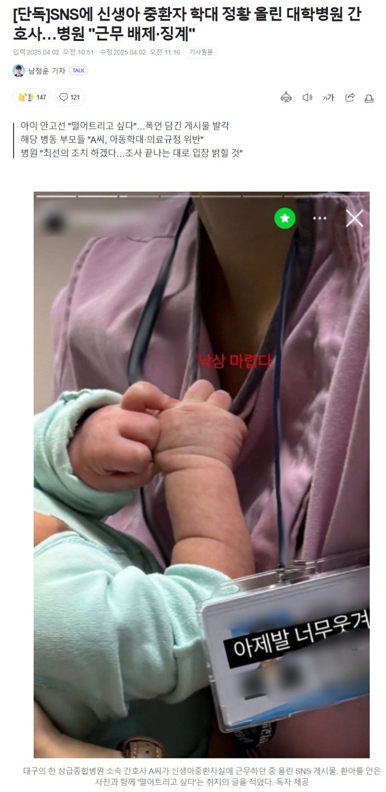 대구 한 상급종합병원 신생아중환자실(NICU) 간호사가 SNS에 폭언과 함께 환아를 찍은 사진을 공유해 아동학대 논란이 일고 있다. 환아 부모들은 병원에 항의하는 동시에 경찰 고발을 검토하고 있다. 병원 측은 현재 해당 간호사를 근무 배제 조치하고, 재발방지를 약속한 상태다.
