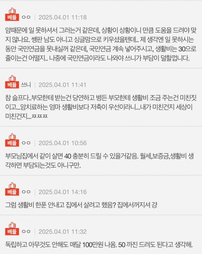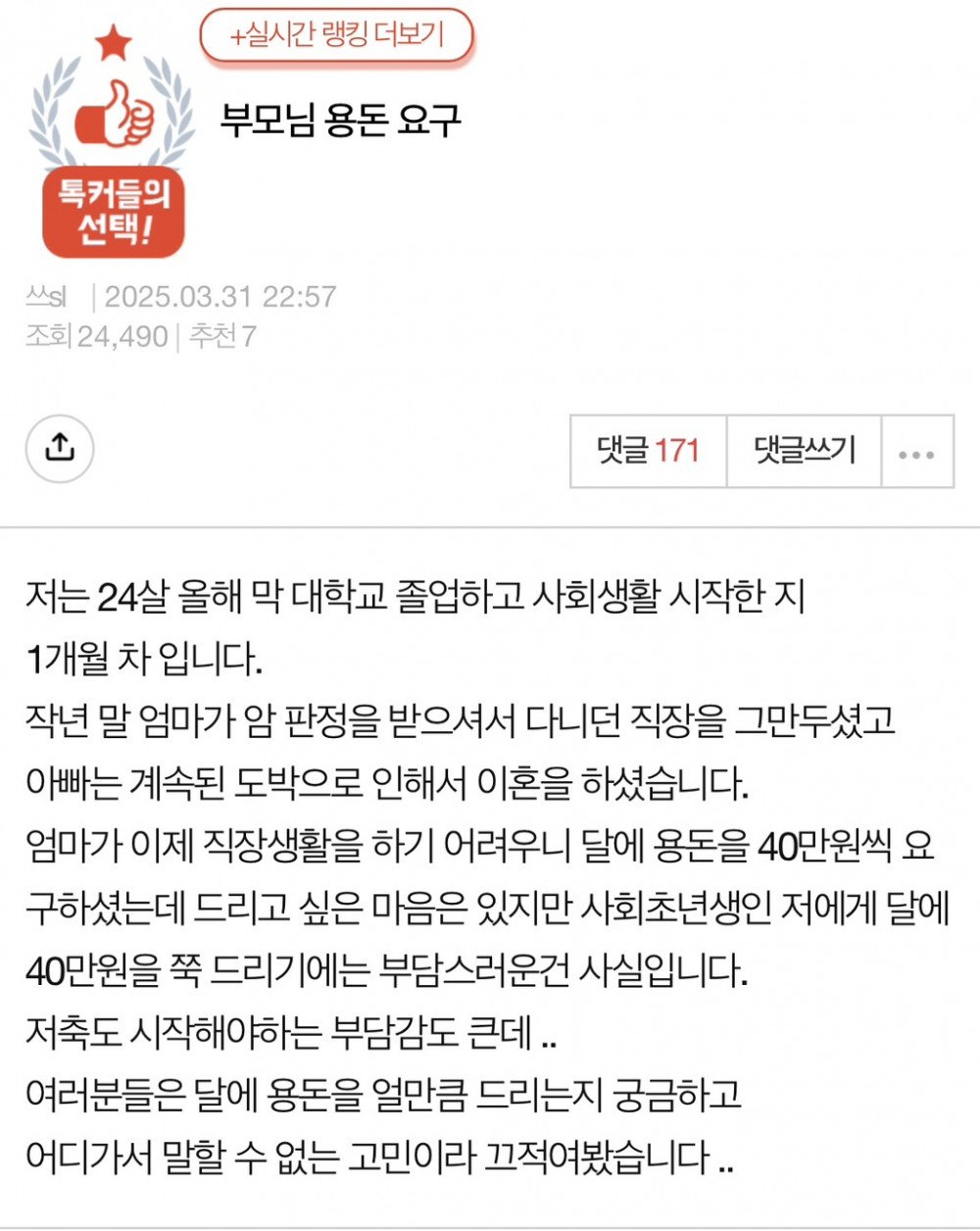 부모님의 용돈 요구가 고민이라는 글