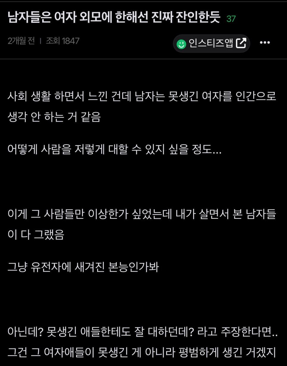 남자들은 여자 외모에 한해 진짜 잔인한 듯