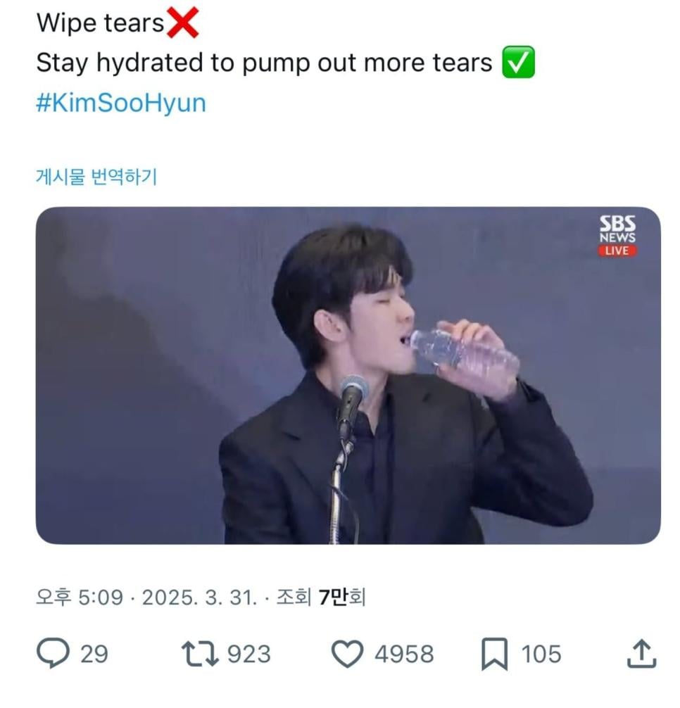 기자회견 중 물 마시는 김수현을 본 외국인의 드립