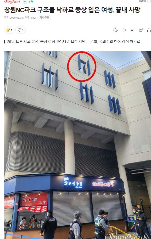 창원NC파크 구조물 낙하로 중상 입은 여성 사망 ㄷㄷㄷ