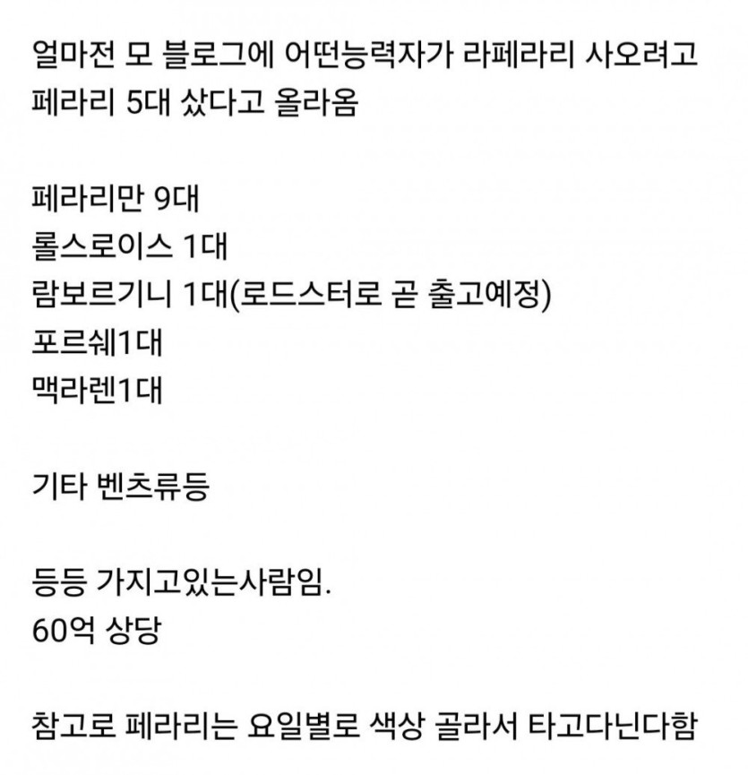 페라리 5대를 한 번에 산 한국 다이아수저 rh1 0 241 0 2025.04.01 23:15 (2015년 글) 저 당시 라페라리 구입 조건이 페라리 5대 이상 소유한 vvip 고객에게만 판매했는데 vvip가 되려고 현지에 가서 페라리 5대를 한번에 구입함 ㄷㄷ ( 당시 페라리458 스파이더 신차가가 옵션포함 5억인걸 생각하면 라페라리 구입 조건을 충족하려고 25억을 먼저 쓰고 라페라리까지 하면 현지에서 총 45억을 씀 ㄷㄷ ) 참고로 지금 라페라리 시세는 50억 이상 호가 페라리 5대를 한 번에 산 한국 다이아수저 0