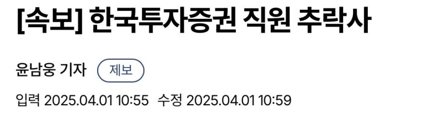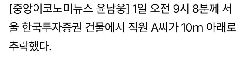 [속보] 한국투자증권 직원 추락사 rh1 0 114 0 2025.04.01 14:45 https://www.joongangenews.com/news/articleView.html?idxno=415462 - 서울 영등포구 여의도 한국투자증권 건물에서 한투 증권사 직원 40대 남성 A씨가 추락 - 3층 10미터 높이 - 심정지 상태로 발견 후, 인근 병원 이송됐으나 사망 - 경찰 측은 추락사인지 투신인지 파악 중 여의도 한투증권 본사 사옥 건물 정면 여의도 한투증권 본사 사옥 건물 후면 변동성 컸던 최근 시장상황과 관련? 아님 다른 이유나 단순사고? 0