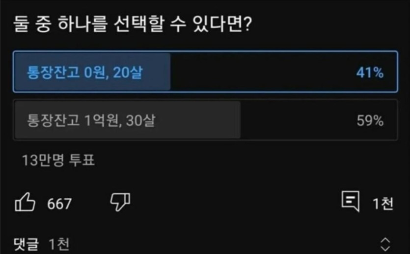 13만명이 투표한 [통장잔고 0원 20살 vs 통장잔고 1억 30살]