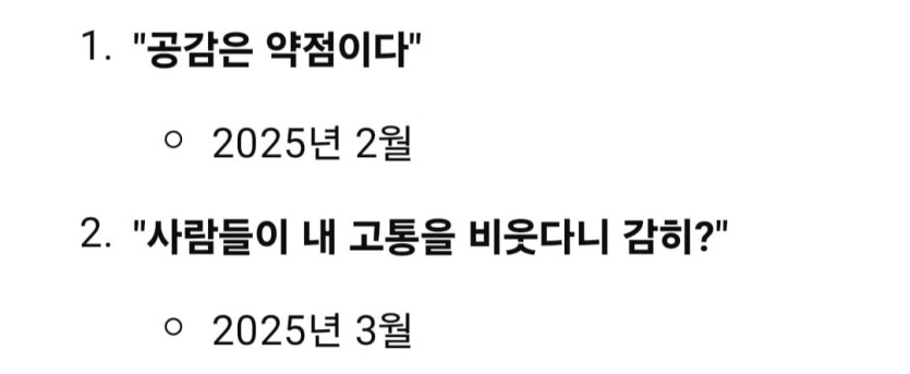 공감은 정신병이라던 앨런 머스크 rh1 0 213 0 2025.03.31 19:30 과거 머스크는 "서구 문명의 근본적인 약점은 공감이며, 이른바 '공감의 착취'다. 서구 문명은 공감이라는 버그를 가지고 있고, 이것이 악용당하고 있다." 그는 또한 공감이 무기화되었다고 말했었다.하지만 이젠 자기에게 공감해줄것을 강요중 ㅋㅋㅋㅋㅋㅋ 0