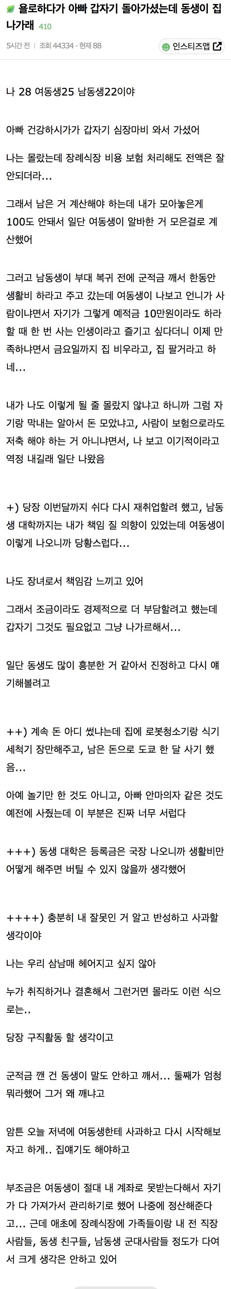 욜로하다가 아빠 갑자기 돌아가셨는데 동생이 집 나가래