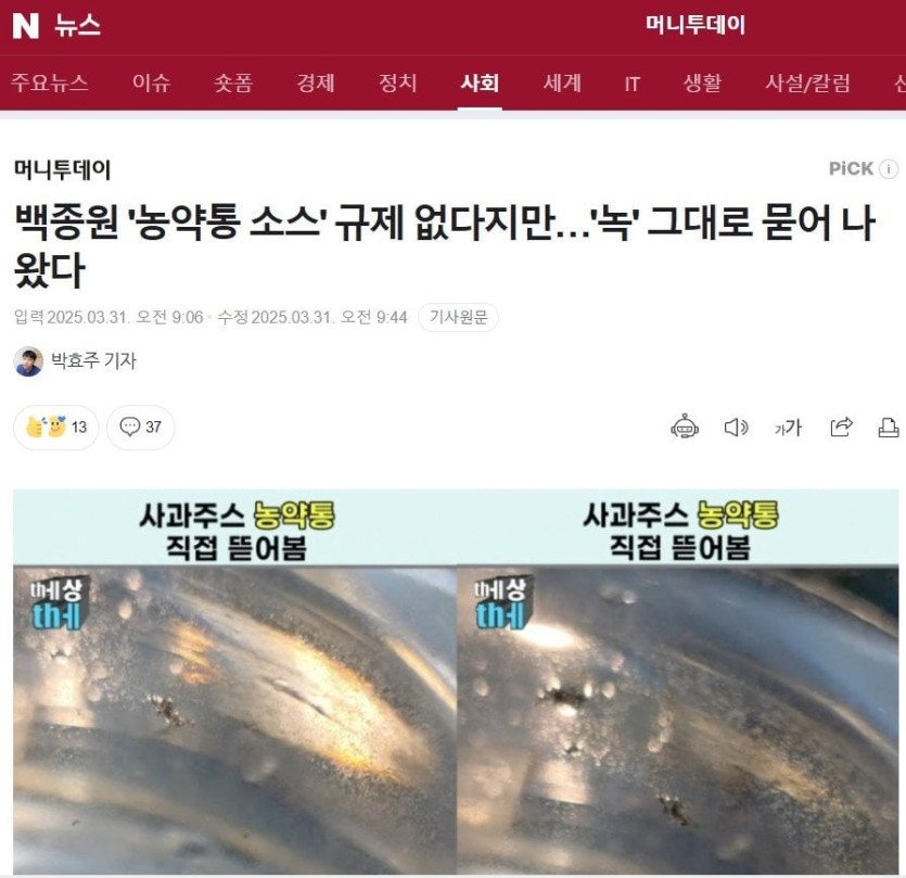 백종원 '농약통 소스' 규제 없다지만 '녹' 묻어 나왔다 rh1 0 220 0 2025.03.31 13:15 백종원대표 관련 컨텐츠 다 짤리고 빡쳐서 실제 농약통 분해한 유튜버분 컨텐츠 뉴스 탔네. 기사전문은 출처로. 출처 머니투데이 박효주 기자 https://news.mt.co.kr/mtview.php?no=2025033108252176113 백종원 '농약통 소스' 규제 없다지만 '녹' 묻어 나왔다 0