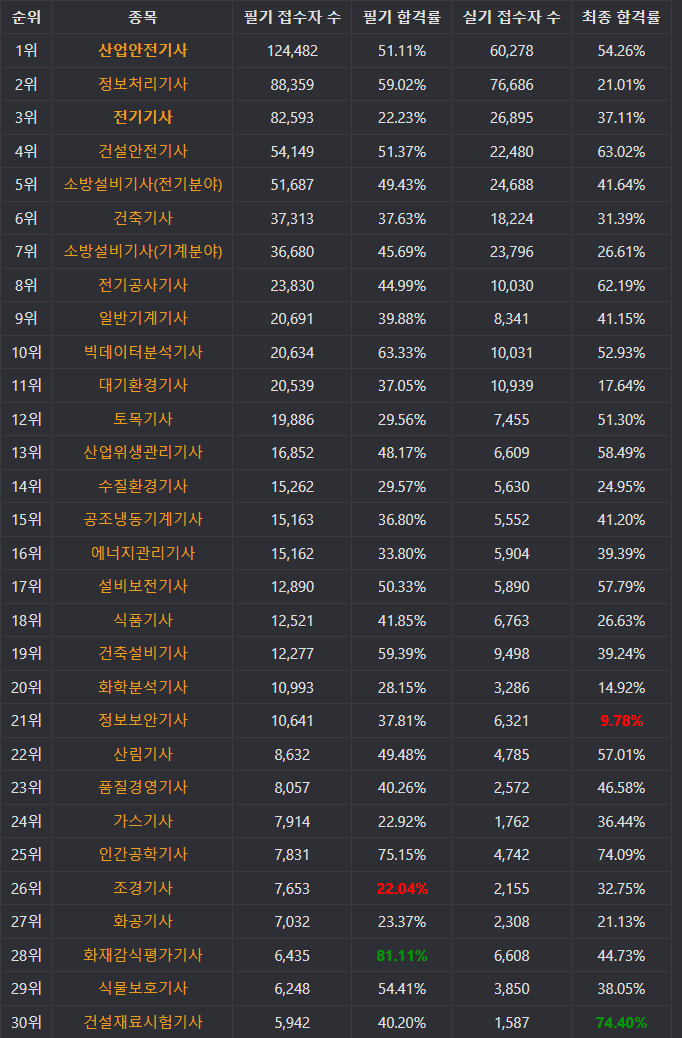 이전 정보처리기사는 응시자격만 있다면 초딩도 한달 공부해서 딸 수 있다는 말이 나돌 정도로 쉬운 난이도와 비슷한 문제 우려먹기가 많아서 기사자격증 중 최하난이도를 자랑했는데