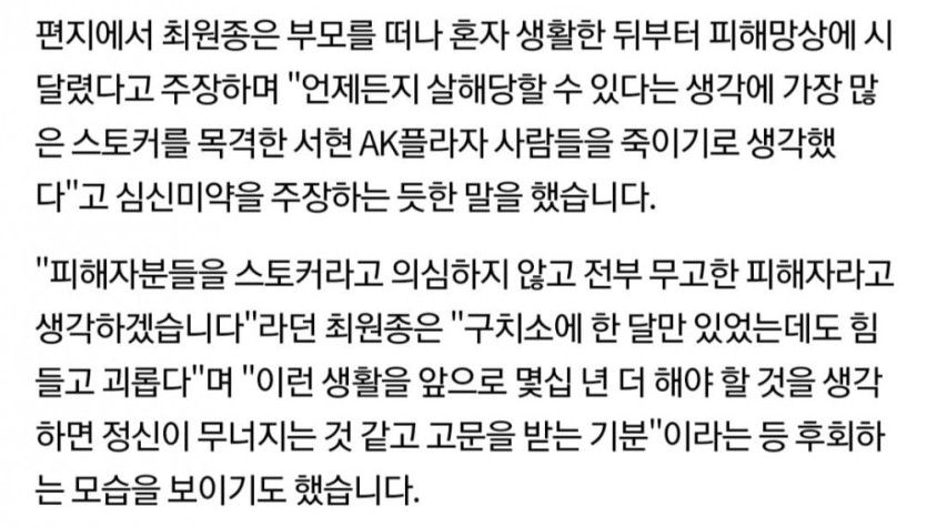그리고 사회에 적응하지 못해서 무고한 사람들에게 분풀이를 하다가 이렇게 됐다고 변명했는데 이건 동정과 심신미약을 노린 것으로 추정한다. 사회에 적응 못하고 분노가 생겼다고 해서 모두가 최원종과 같은 행동을 선택하지 않는다는 점에서 구차한 변명이다.
