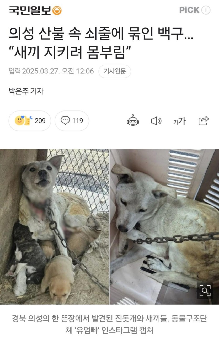 [감동] 의성 산불속에 쇠줄 묶여 발견된 백구