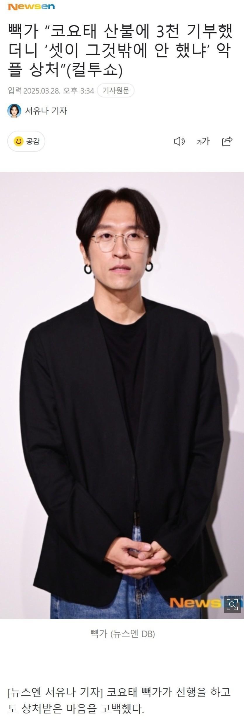 코요태 빽가, “산불에 3천 기부했더니 ‘셋이 그것밖에 안 했냐’ 악플 상처”