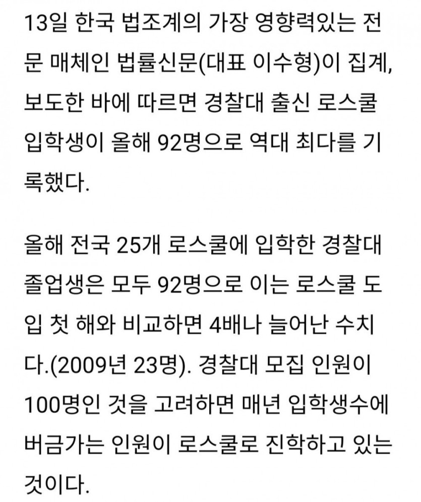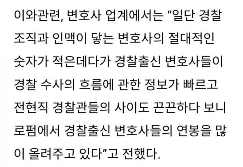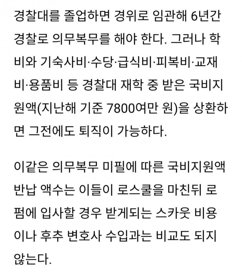 로스쿨 사관학교가 된 경찰대 근황 rh1 0 141 0 2025.03.29 23:15 경찰대 출신 변호사는 경찰 인맥이 좋아서 로펌에서 선호함. 경찰대 졸업만 하면 자동으로 경찰간부가 되고 6년 의무복무해야 함. 하지만 의무복무 미필해도 뱉어낼 돈은 변호사만 되면 쉽게 갚을 수 있음. 로스쿨 사관학교가 된 경찰대 근황 0