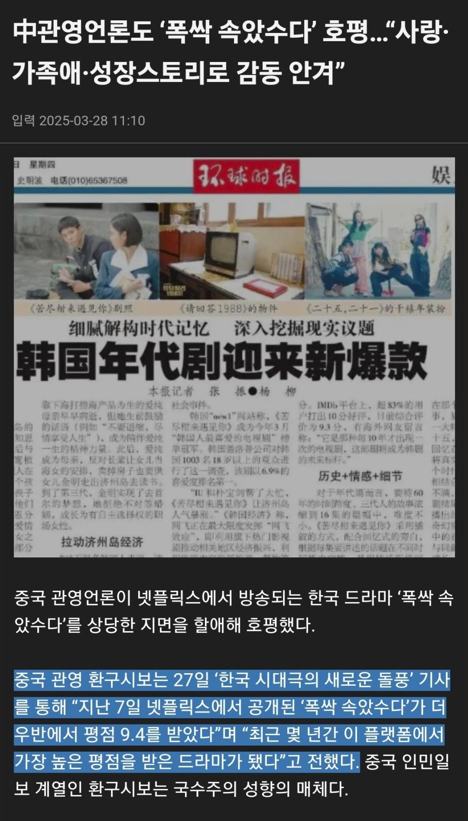 한한령에 넷플릭스도 안나오는곳인데 관영매체 평가ㅋㅋㅋㅋㅋㅋ