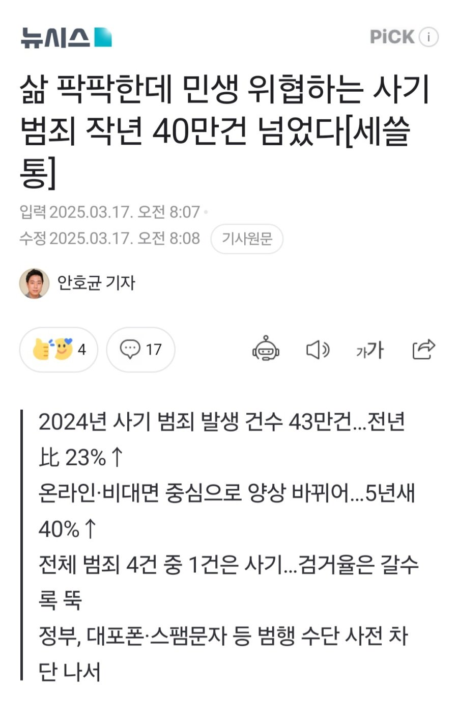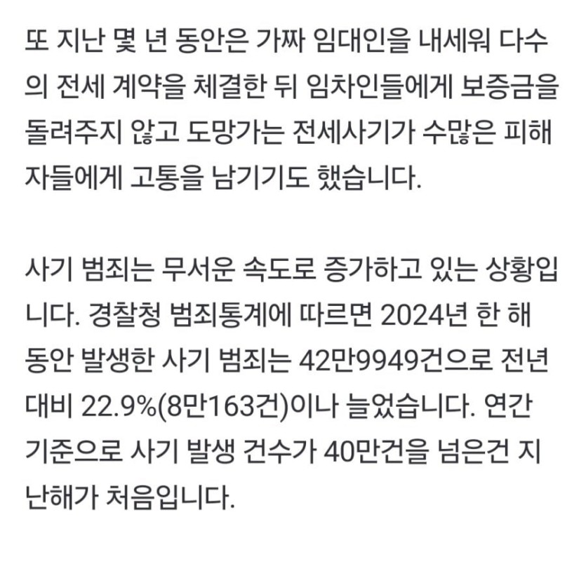삶 팍팍한데 작년 사기 범죄 40만건 rh1 0 320 0 2025.03.29 16:15 주요 경제범죄의 양상도 바뀜 2009년엔 강도사건이 한해 6300건 넘게 발생했으나사기는 22만건이었고 2020년대 들어와서 강도는 500~700건대를 유지하고있으나 사기범죄는 30만건이상을 기록함 특히 작년은 43만건으로 역대 1위 삶 팍팍한데 작년 사기 범죄 40만건 0
