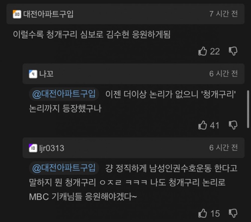 어떤 영포티 커뮤가 김수현을 응원하는 이유 rh1 0 202 0 2025.03.29 10:15 “여론이 욕할수록 청개구리 심보가 세지기 때문”김수현 수호단들 논리가미자때 사귄 증거있냐 에서미자를 선호하는게 생물학적으로 왜 잘못이냐에서이젠 아예 그냥 여론이 욕하니까 실드친다는 수준으로 퇴보함낙동강 방어선도 아니고 이미 피난선으로 남베트남 난민들 실어나르는수준 ㅋㅋㅋㅋ 어떤 영포티 커뮤가 김수현을 응원하는 이유 0