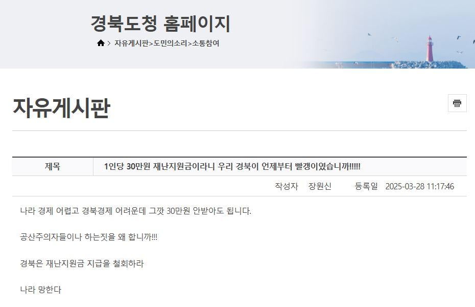재난지원금 받으면 빨갱이라는 경북도청 홈페이지