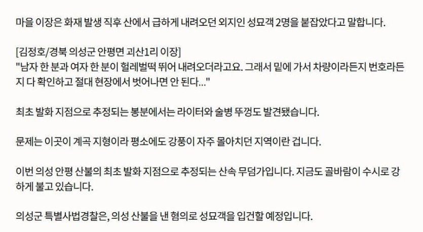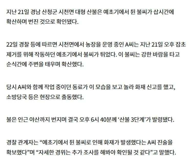 현재 대규모 산불 원인의 극과극 rh1 0 156 0 2025.03.28 06:15 예초하다가 예초기에서 튄 불씨가 산불로 번짐즉시 본인들이 화재 신고함성묘 하다가 산불내서 도망치다가 마을 이장한테 붙잡힘 0