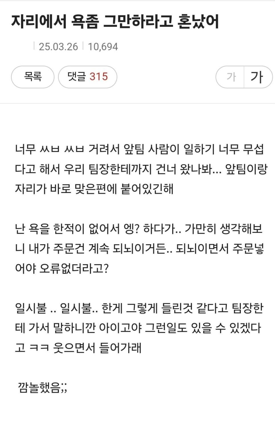 자리에서 욕 좀 그만하라고 혼났어