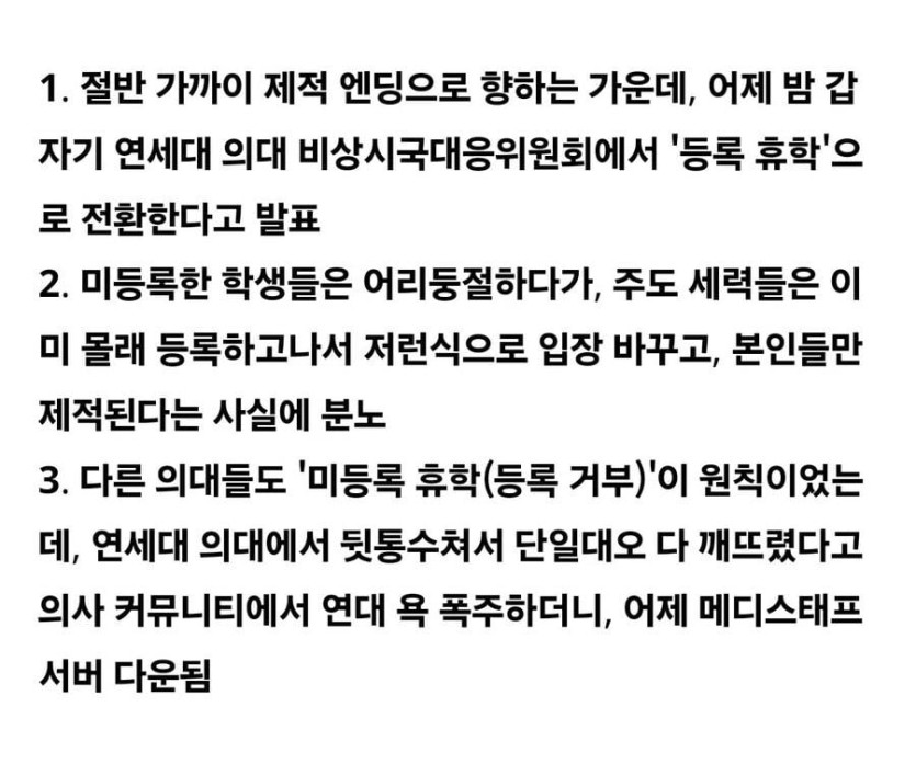 [유머] 현재 뒷통수 맞아버린 연세대 의대생들 근황 ㅎㄷㄷㄷㄷ rh1 0 147 0 2025.03.27 13:30 학생들끼리 우리 전부 등록거부하자!!! 외치다가등록기간이 끝난 후 자기들만 몰래 등록하고는 등록거부 보다는 등록휴학으로 전환해서 싸우자고 문자돌림 등록안한 절반은 제적될 예정 0