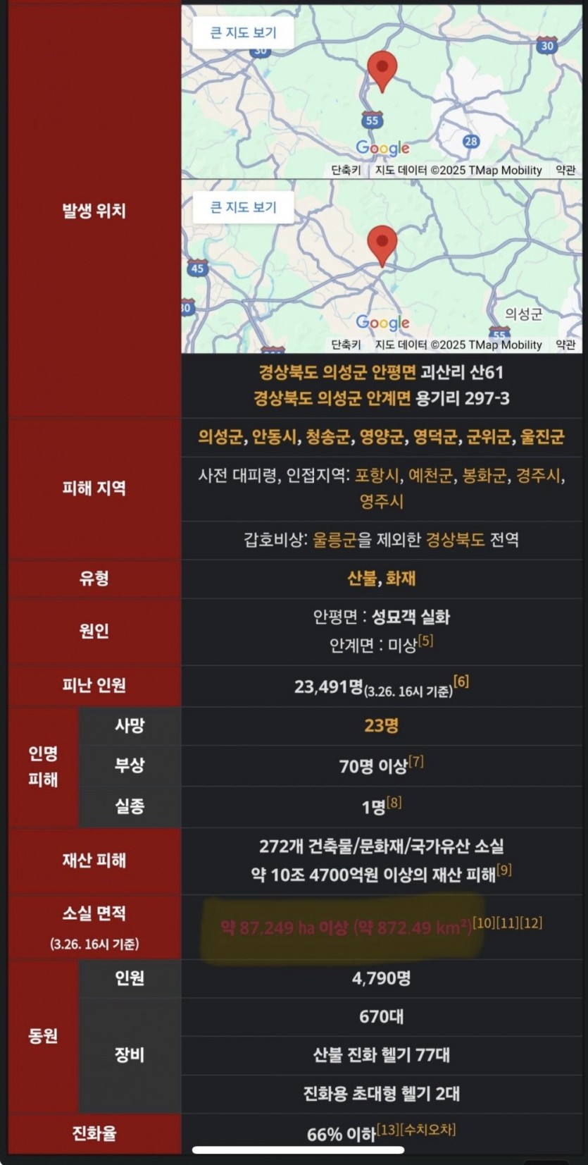 LA 산불의 피해면적 4배가 된 경북 산불 rh1 0 217 0 2025.03.27 00:15 올해 초, 전세계를 떠들썩하게 했던 미국 남부 캘리포니아 산불 엄청난 피해를 발생시킨 당시 LA 산불의 피해 면적은 23,200 헥타르 / 231.38 제곱킬로미터 였다 그리고 현재 우리나라의 경북 의성 안동 산불의 피해 면적은.. 4배 가량인, 무려 87,249 헥타르 / 872.49 제곱킬로미터이다 문제는 이것이 확정된 수치가 아니라 현재진행형이라, LA산불의 4배 규모 이상이 될지도 모른다는 것 아무쪼록 더이상 큰 피해 없이 진화 처리가 이뤄지길 LA 산불의 피해면적 4배가 된 경북 산불 0