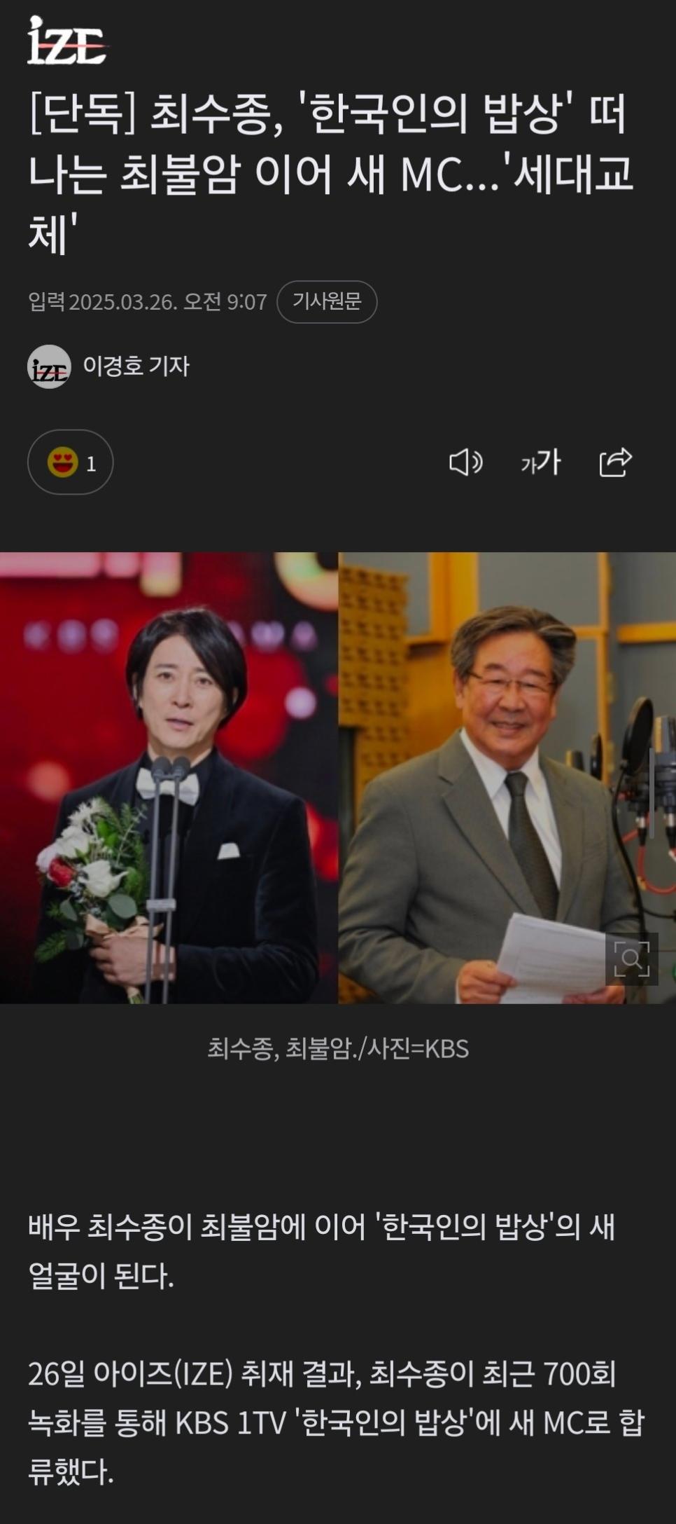 한국인의 밥상 새MC는 최수종
