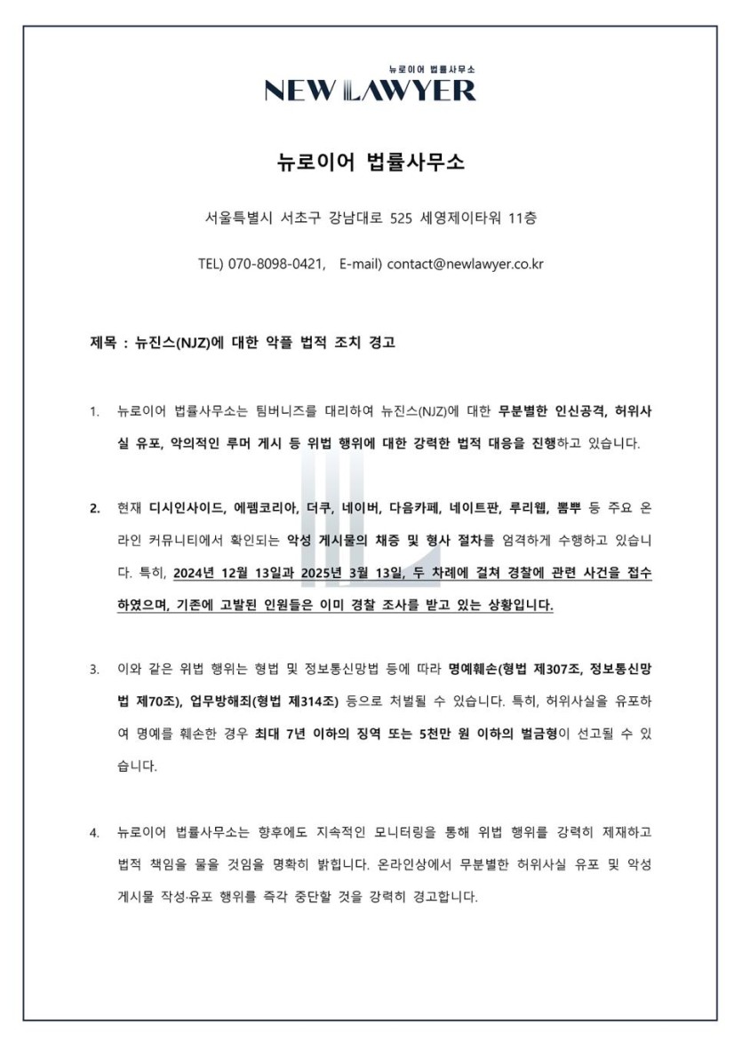 뉴진스(NJZ)에 대한 악플 법적 조치 경고