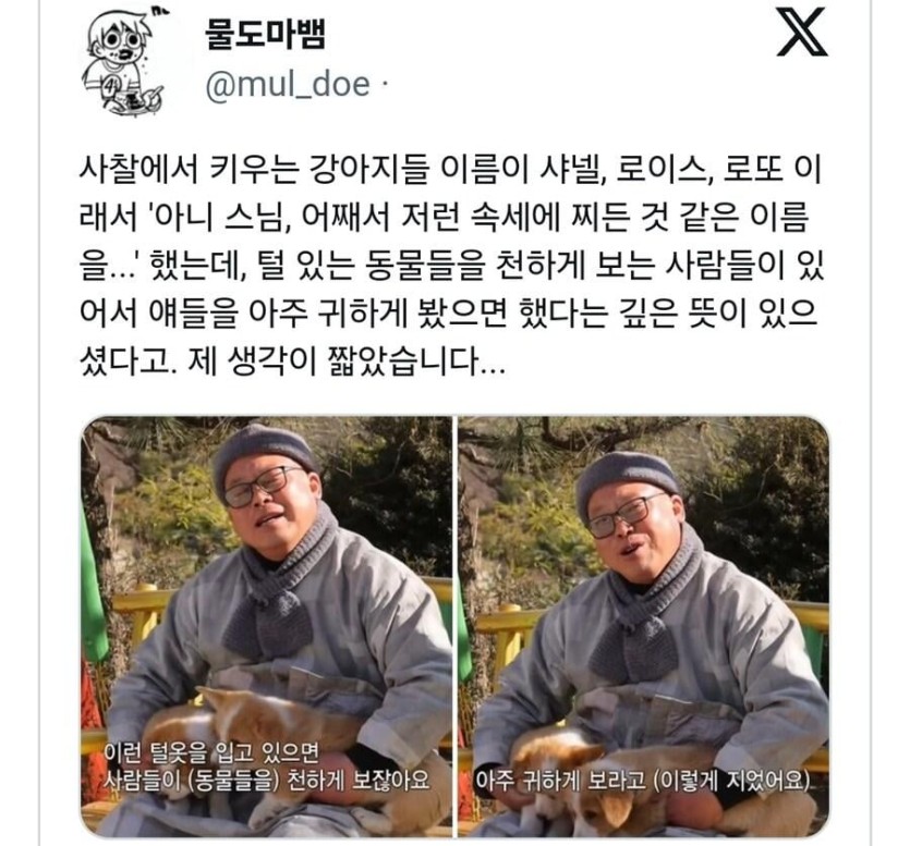 사찰에서 키우는 강아지들 이름이 샤넬, 로이스, 로또인 이유