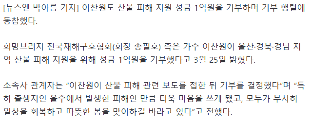 산불 피해 지원 성금 1억 기부한 연예인 rh1 0 150 0 2025.03.25 22:15 https://m.entertain.naver.com/article/609/0000967488 산불 피해 지원 성금 1억 기부한 연예인 0
