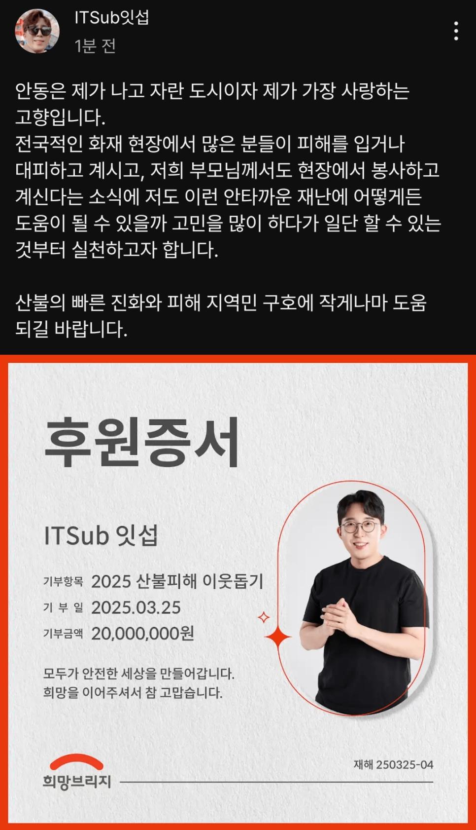 유튜버 잇섭 안동 산불에 2천만원 기부.jpg