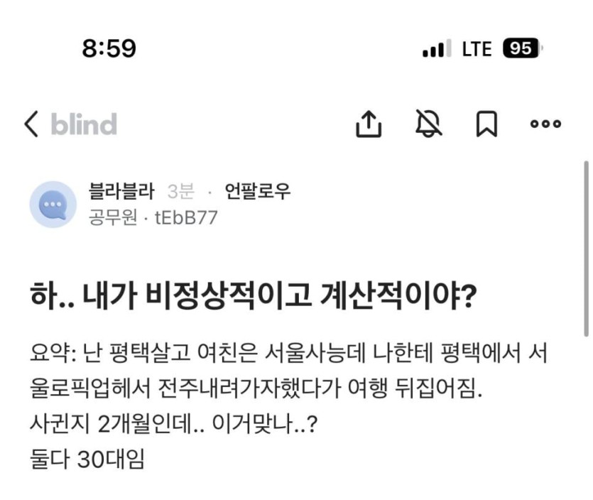 자신이 비정상적이고 계산적이냐고 묻는 공무원.jpg rh1 0 191 0 2025.03.25 21:00 요약)커플 둘이 전주로 여행감 남자는 평택 여자는 서울사는데 여자가 남자보고 픽업해달라함남자는 전주와 평택이 더 가까우니 내려와달라함 0