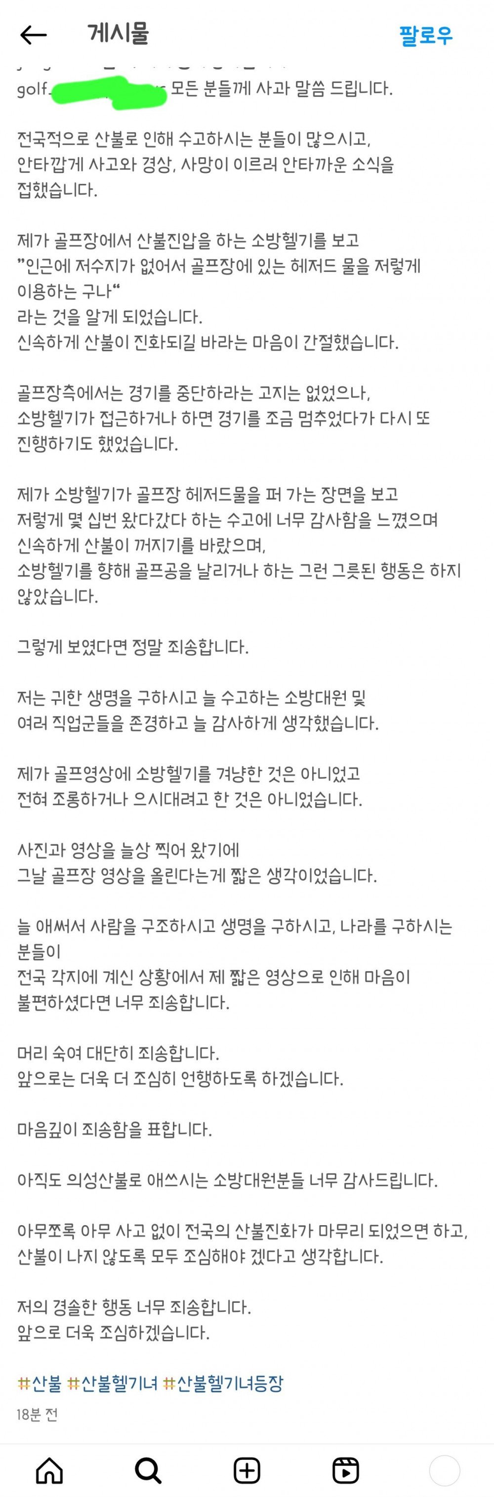 [기타] 산불진압 하는 소방헬기 방향으로 샷을 치던 골프장녀 사과문