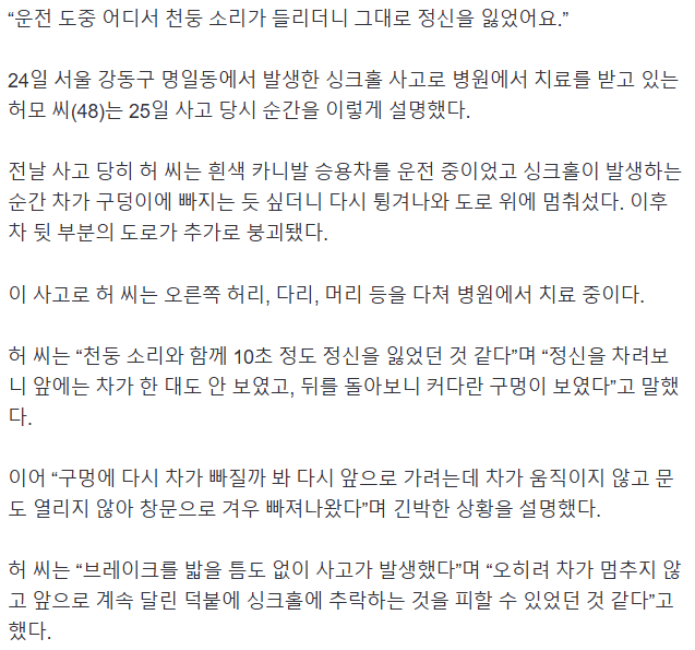 강동구 싱크홀 생존자 “천둥소리 들린 뒤 정신 잃어” rh1 0 180 0 2025.03.25 20:15 https://n.news.naver.com/mnews/article/020/0003623575?sid=102 강동구 싱크홀 생존자 “천둥소리 들린 뒤 정신 잃어” 0