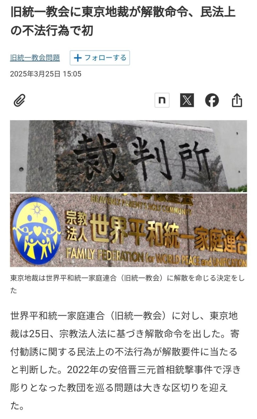 속보) 일본, 통일교 해산 명령