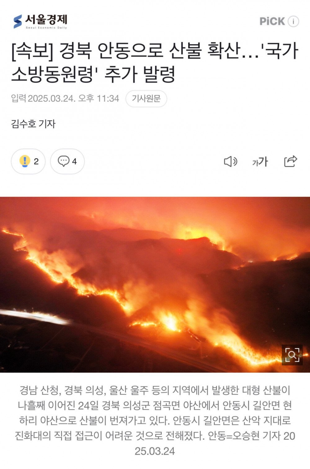 경북 안동으로 산불 확산…'국가 소방동원령' 추가 발령 rh1 0 244 0 2025.03.25 10:15 https://n.news.naver.com/article/011/0004465293?sid=102 비 좀 내려주세요? 경북 안동으로 산불 확산…'국가 소방동원령' 추가 발령 0