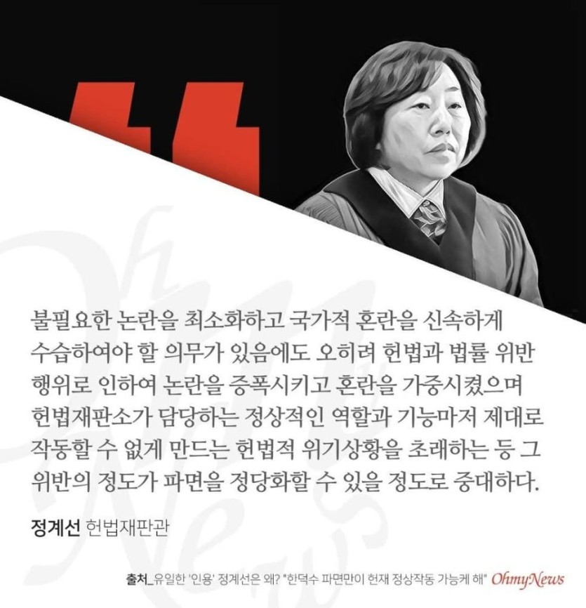 헌재 내 유일한 상식적 재판관인 정계선 재판관.jpg rh1 0 146 0 2025.03.24 23:30 나머지 7명은 모두 법레기의 모습 그 자체네요.헌재는 이제 소멸의 길만 남았네요 0