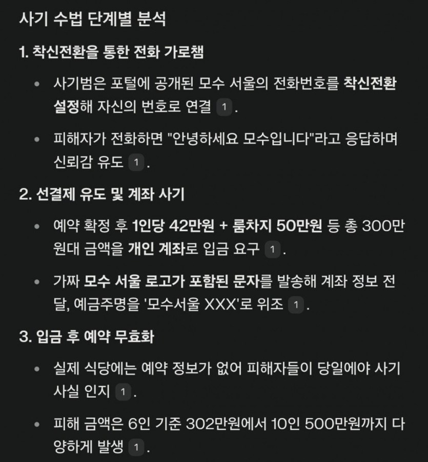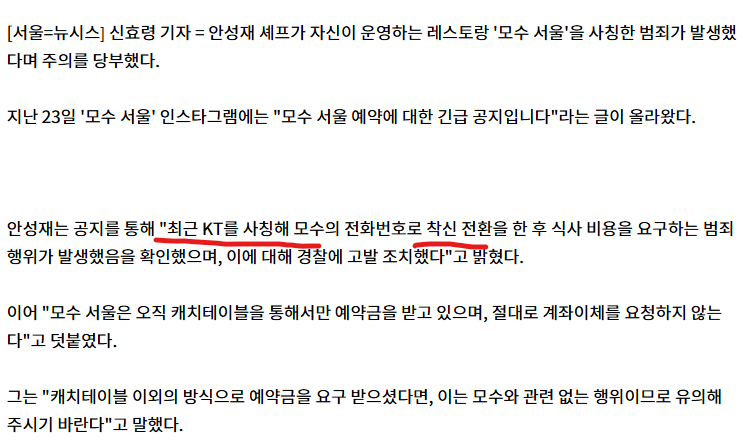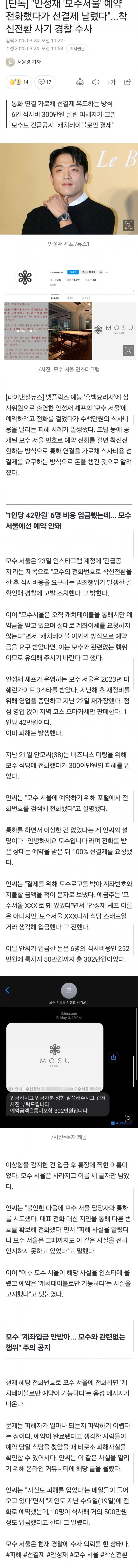 안성재 '모수'에서 착신전환 선결제 300만원 사기 발생 rh1 0 235 0 2025.03.24 16:15 KT직원 사칭해서 착신전환 한거같음 아 진짜 무섭네 사기꾼들 안성재 '모수'에서 착신전환 선결제 300만원 사기 발생 0
