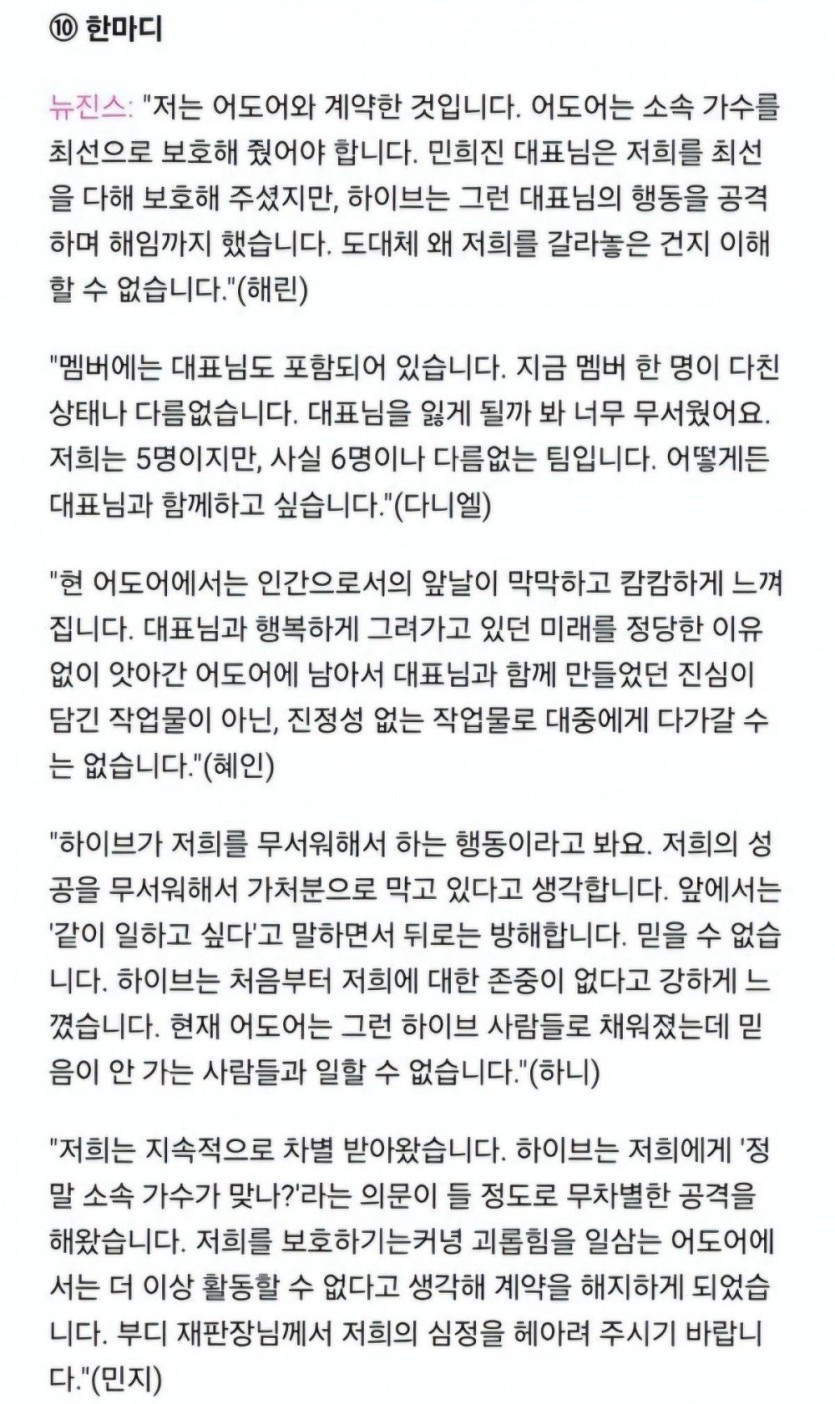 어도어와의 가처분 소송에서 뉴진스 멤버들 마지막 발언