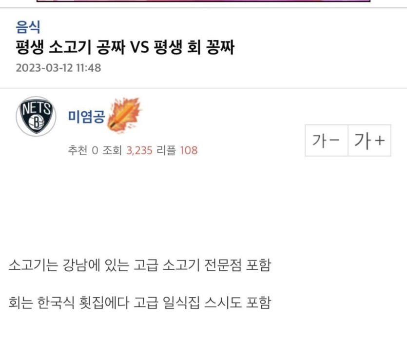 평생 소고기 공짜 VS 평생 회 꽁짜