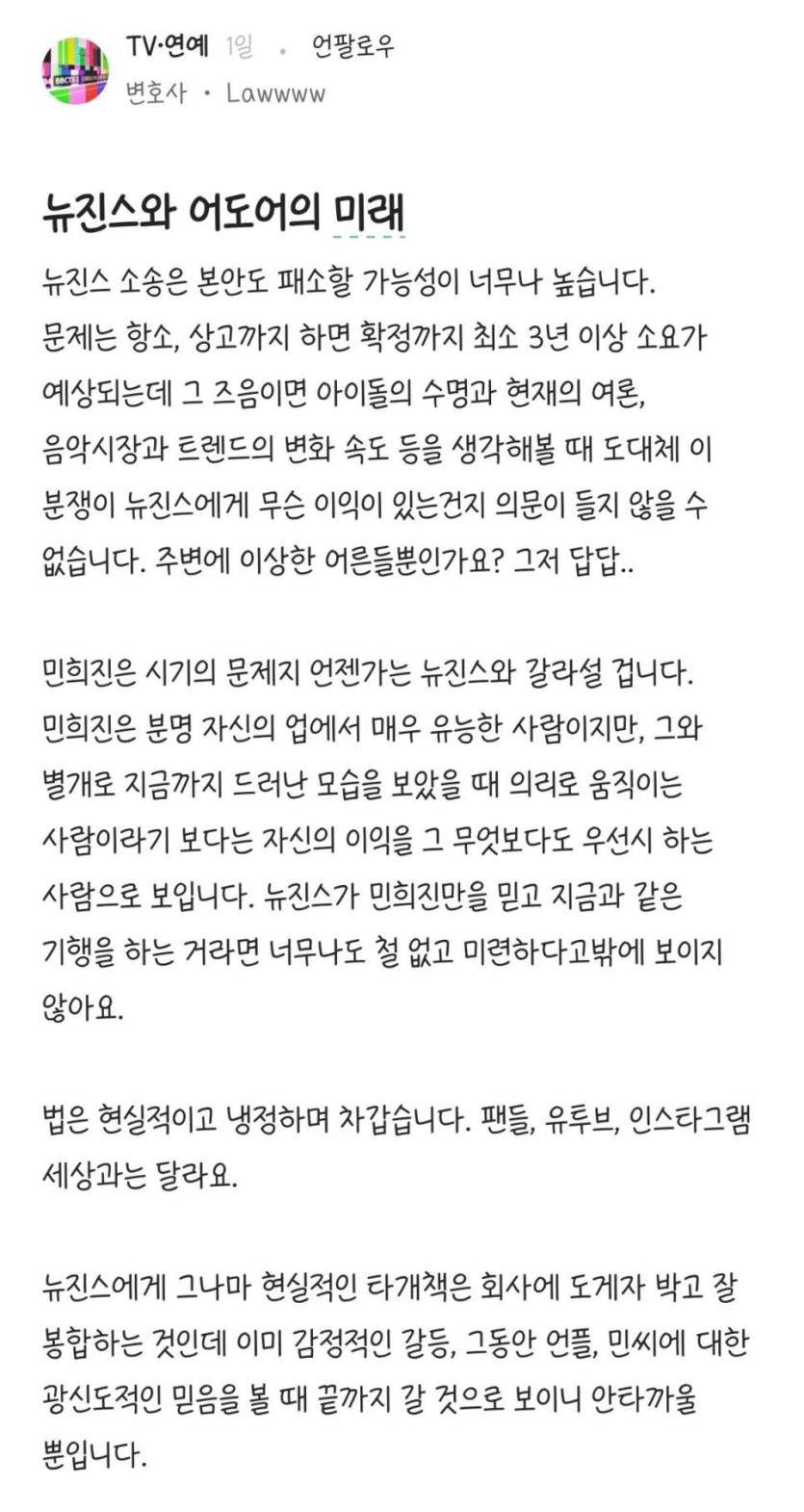 [유머] 변호사가 쓴 뉴진스와 어도어의 미래 예상글