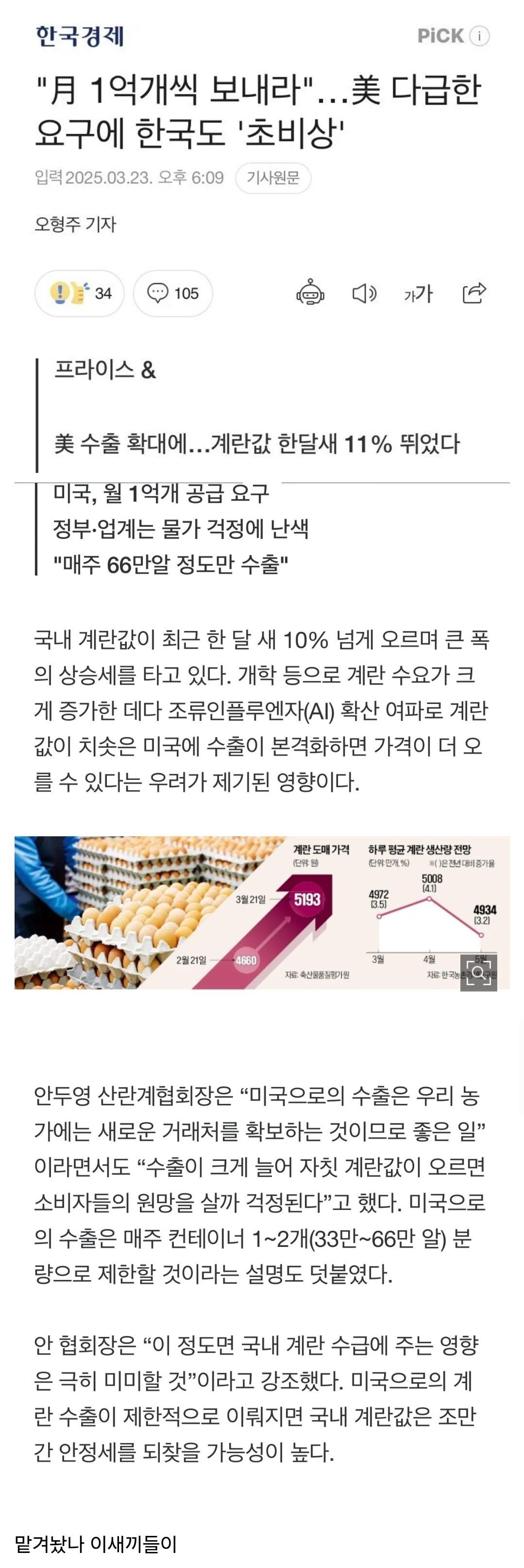 미국 "월에 1억개씩 계란 보내라" 한국 '초비상'