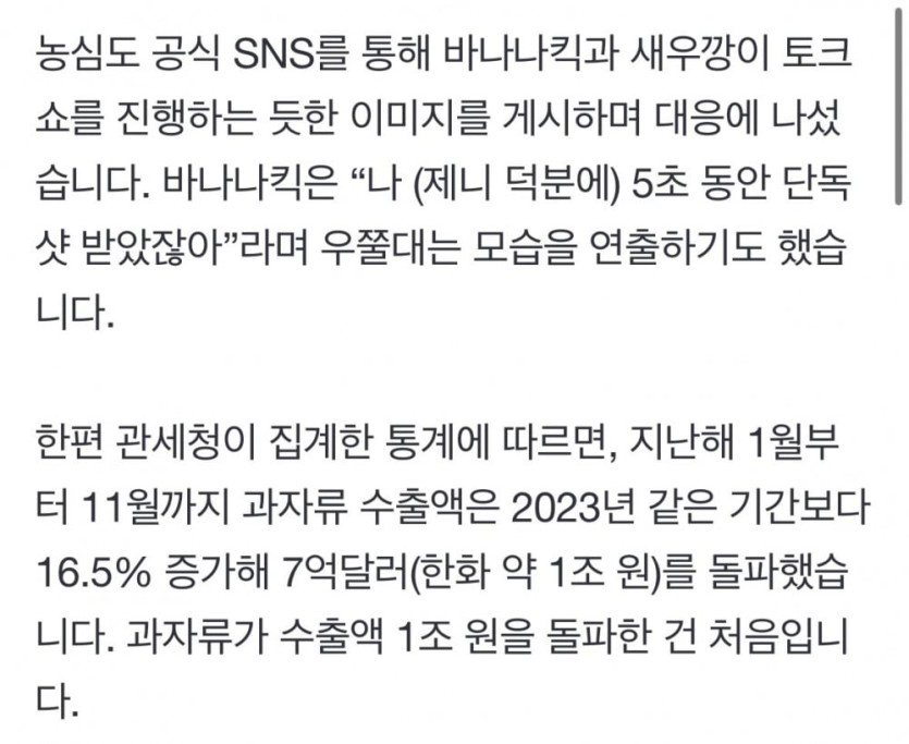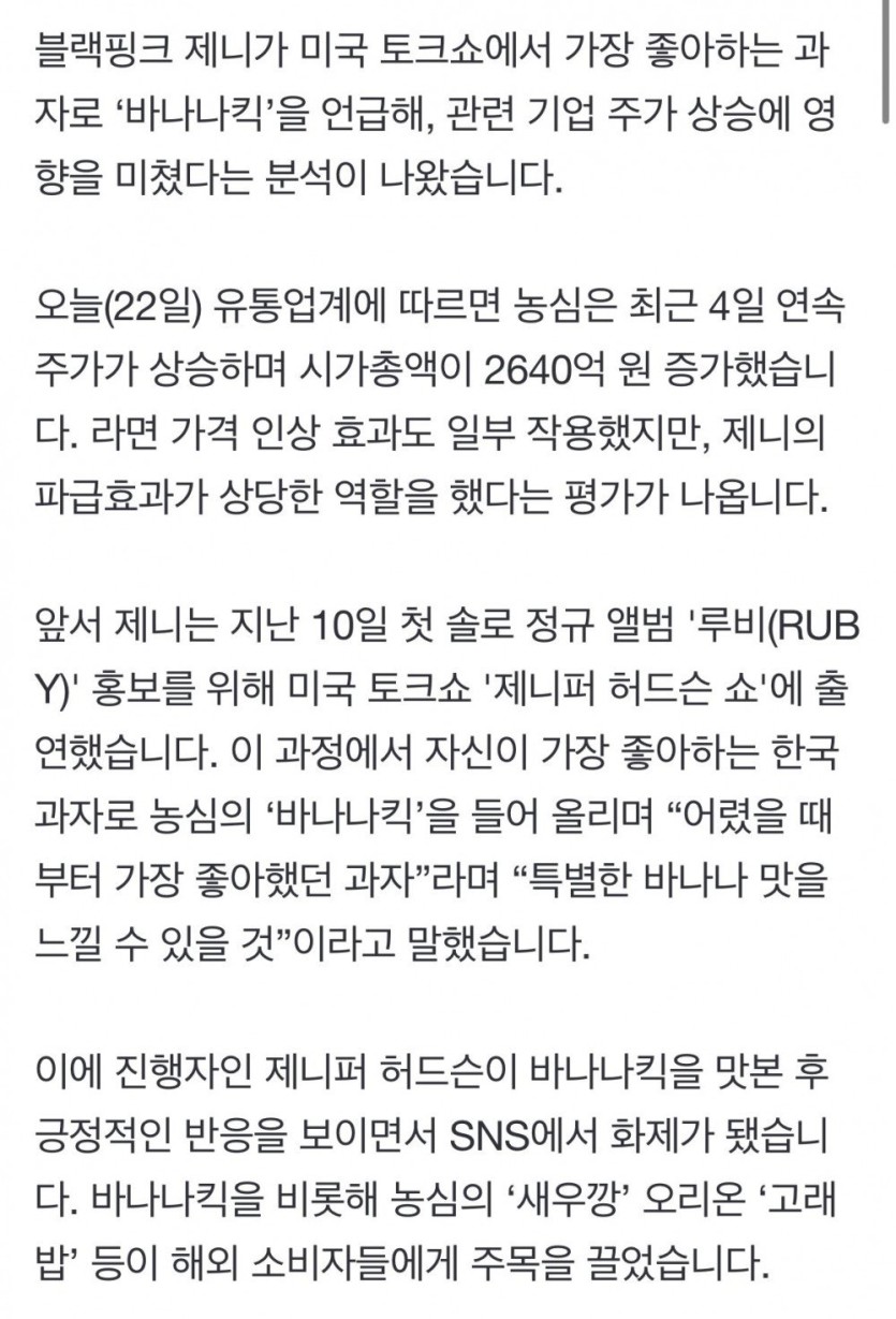 제니 "최애는 바나나킥" 한마디에…시총 2640억 급등 rh1 0 279 0 2025.03.22 19:15 https://naver.me/xq3sAhSs농심조차 인정 ㅋㅋㅋ다음주부터 주식장은 제니매매법 들어간다입만 열어봐라 .. 아주 그냥 풀매수 박는다 제니 "최애는 바나나킥" 한마디에…시총 2640억 급등 0