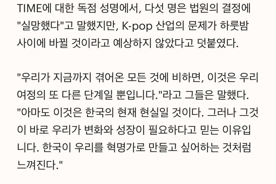 뉴진스, 한국이 우리를 혁명가로 만들고 싶어하는 것처럼 느껴진다 rh1 0 236 0 2025.03.22 03:45 https://time.com/7270186/njz-newjeans-exclusive-hybe-ador-legal-battle-complexcon-hongkong/ 0