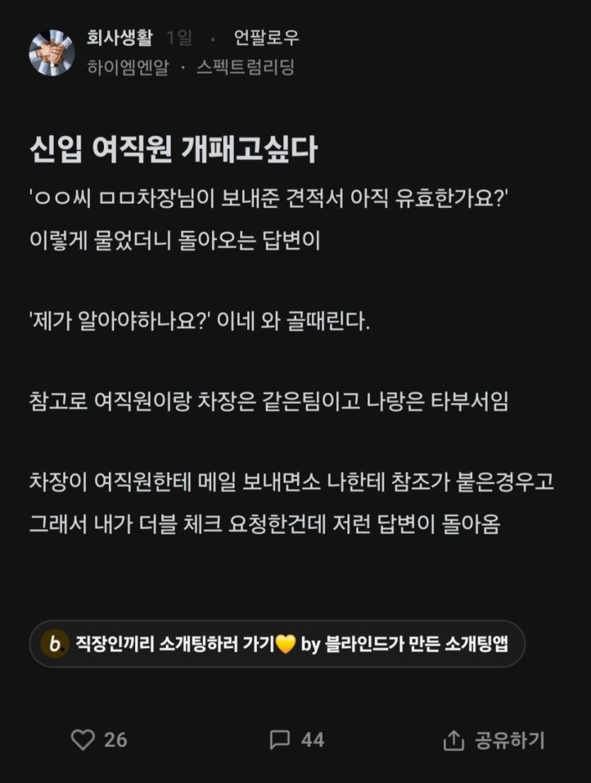 신입 여직원 개패고싶다.blind
